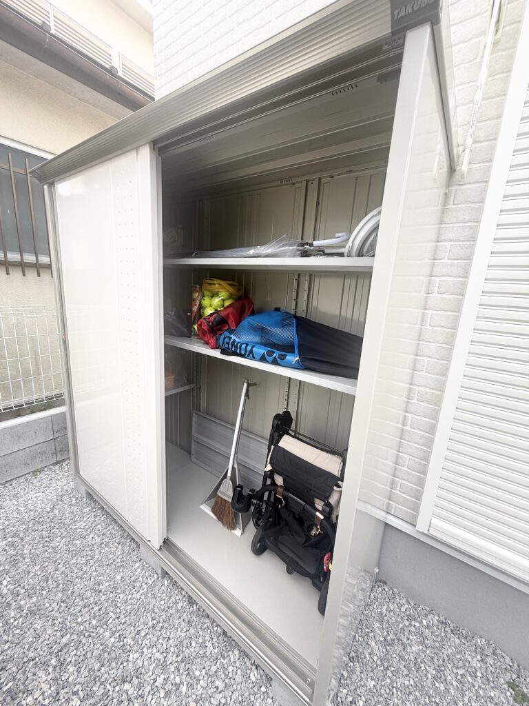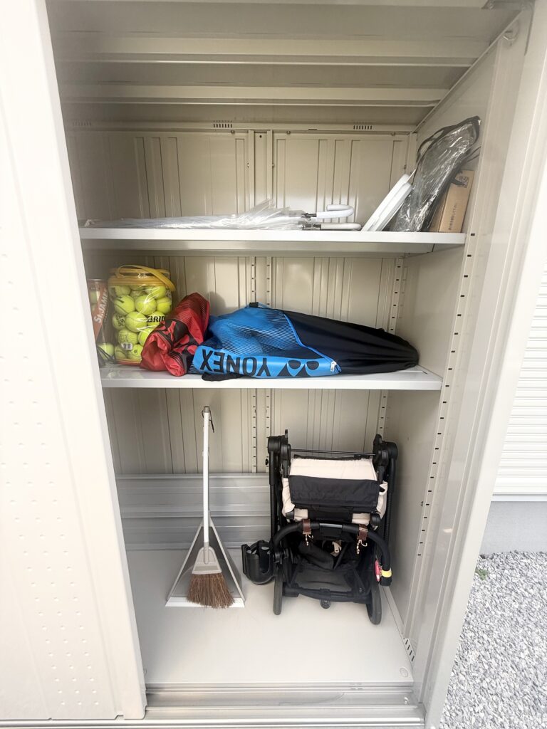 物置にあれば外出する前に取り出し導線もスムーズなので物置に置きました。